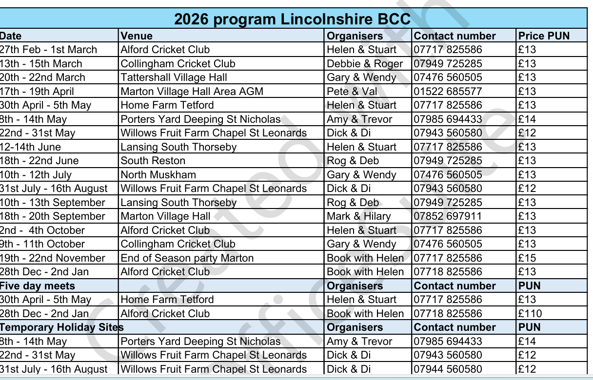 Lincolnshire Area British Caravanners Club Meets 2026